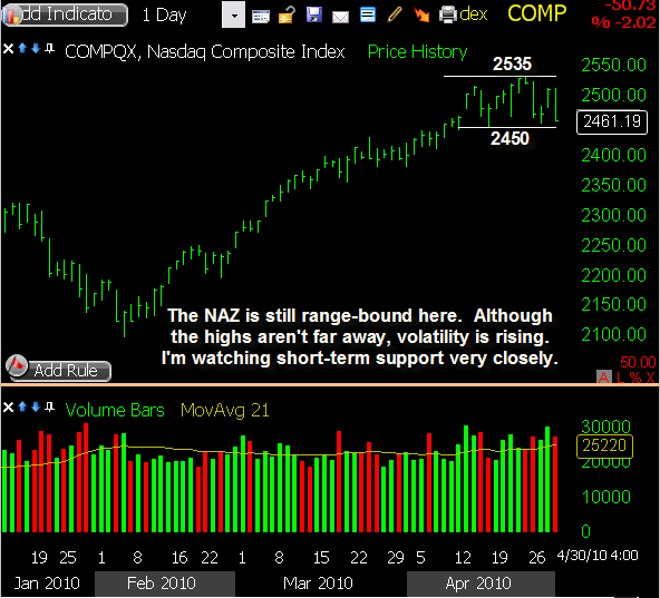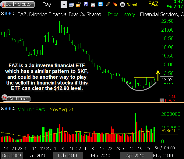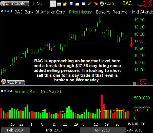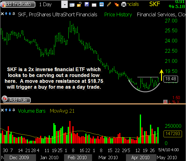 JPM triggered a short sale this morning on the open, gapping slightly through my intended entry price and heading lower initially. However, as the market stabilized, this stock did too, and a bounce followed. With a pretty tight stop already in place, I was taken out of this trade for a 2.7% loss, and will step aside for the time being. This one still appears in danger of lower prices, but today’s reluctance to drop suggests I’m early so I’ll keep it on watch for now.