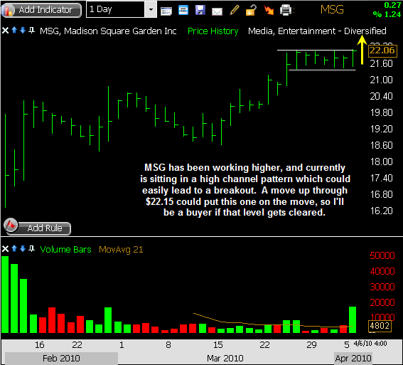 MSG continues to trade with very light volume, which isn’t serving me well on a couple of fronts. First, it’s preventing any lasting upside, as there simply is no “fuel” to the buying efforts we’ve seen. Second, the thinly-traded price action makes for sudden moves which can emerge at any time, leaving me a bit uneasy with this position at the moment. I’ve tightened my stop tonight, and will be watching this one closely in case a further adjustment is needed.
