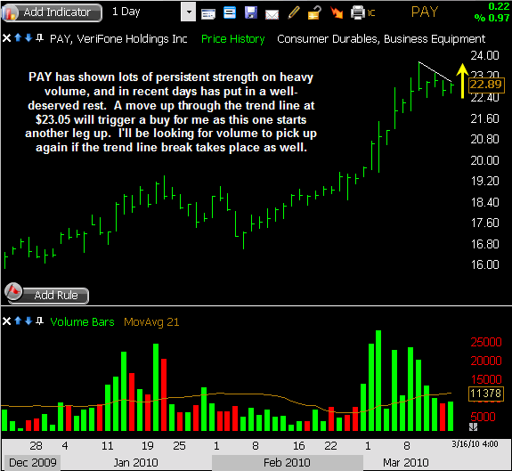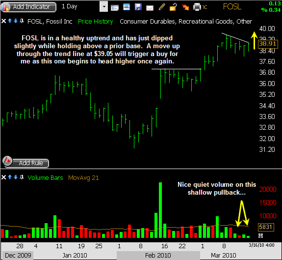 FOSL began Friday with some nice relative strength as it made a new high for the week while the indexes began to sell off. However, the broad weakness took its toll on this one, and it ended up sliding lower for the remainder of the session as it built a bearish engulfing bar on the daily chart with expanding volume. This stock is still above recent support, so I’m willing to stay with it for now using my existing stop loss level, but this reversion back into the base suggests it may need more time to get moving.