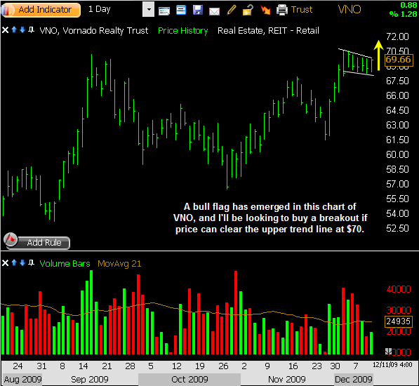 VNO posted an inside day on light volume today, pulling back to test the breakout zone. Although I’d have rather seen it sprint higher, this is probably healthy action and thus far is not cause for alarm. I’m sticking with my original stop loss for now, but will be on watch for strength to resume soon.