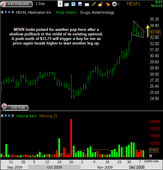 MDVN has been on quite a run lately, pausing for occasional rests on the way up. Over the past few days, this one has pulled back in a shallow fashion and stabilized, implying it could turn higher once again very soon. I’ll be a buyer if this one can clear $33.75 to turn back up out of this bull pennant pattern.