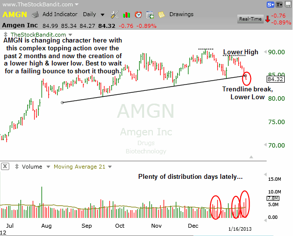AMGN has stalled out lately, created a lower high, and then today it marked a lower low as it broke the December pullback low and undercut rising support going back to September. This marks a negative change of character to the bearish side. This stock is a slower mover, which means it’s likely best now to wait for a feeble bounce before considering shorts since it just dropped 5% in 5 sessions. Also note the recent distribution days with elevated downside volume as early indications of this shift of direction.