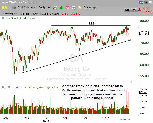 BA is the ticker for Boeing but perhaps a more fitting description is Bad Attitude given all the negative press of late. Today the stock took another hit based on news of more groundings in Japan of the 787 Dreamliner. The pervasive negative news is more of a nightmare in public relations for this stock despite widespread understanding that new aircrafts tend to have a period in which the kinks get worked out. Shares took a hit today but overall they’re still basing beneath first resistance at $78.