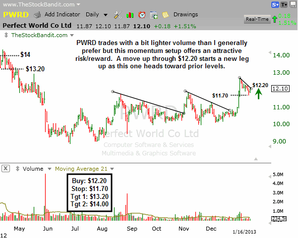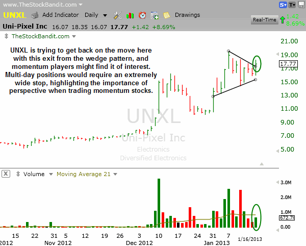 UNXL went parabolic in December and then again earlier this month before spending the last two weeks trying to rest. This one is perking back up and is on the radars of momentum players. One could make a case for another move starting here with today’s push past the trend line on expanding volume. The wide-ranging green bars look pretty sexy until a closer look at nearest support is considered, which happens to be about 14% away, so always keep that in mind when watching the flashy names like this one. The tighter patterns might mean less upside potential than a chart like this, but they certainly come with better-defined risk as well.