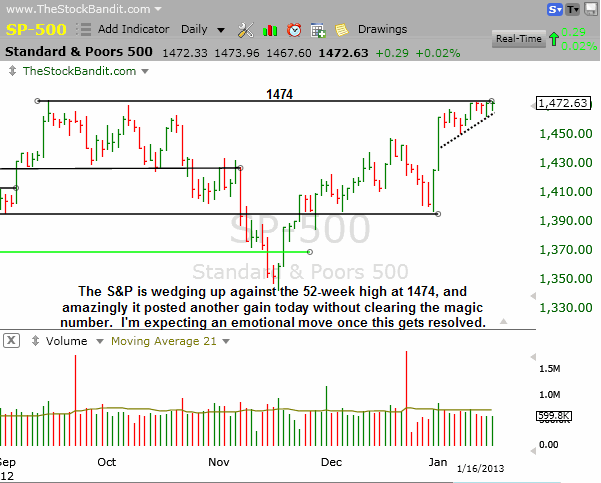 SP500 – The S&P incredibly went up today yet still remained shy of 1474. This is setting up for a potentially very strong breakout (if it ever happens) or a quick retreat from this level if traders become impatient, so I’m starting to expect an emotional move once we see a direction chosen.