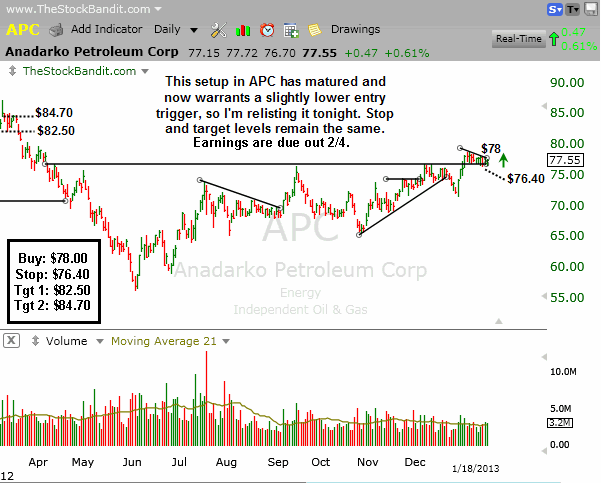 APC was listed here last week with a $78.30 trigger price which has still not been met. This pattern has tightened in the past few days, hence the reason I’m relisting it here with a revised trigger price of $78.00. My stop and target levels are the same and I still like this pattern, but I’m waiting for it to confirm this pattern before making an entry.