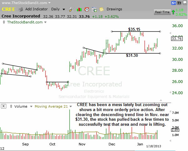 CREE is caught between a pair of key levels near $31.30 and $35.15, respectively. Last week this stock lifted from support and now seems intent on filling the gap from a couple of weeks ago as it works its way back toward the upper portion of the range. Expect more shifts of direction until a meaningful exit from this range is seen.