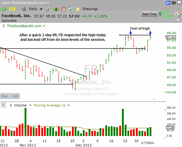 FB is a highly liquid stock and yesterday reversed higher then showed follow through today to return to test the high. Rather than breaking it, however, it stopped 3 cents shy of it ($58.55 vs. $58.58) today then backed off a bit. This is why it is so helpful to identify and keep watch on recent levels, because they tend to be respected.