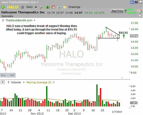 HALO is sitting in a wedge here and has been testing support in recent days, including a false breakdown on Monday. A turn up through the small descending trend line at $15.15 looks good for a single-day play as this one gathers attention and attempts to move back toward the recent high.