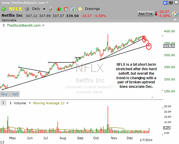 NFLX has been pointed out here a few times in recent weeks, including the Charts on Demand videos on 12/5, 12/12, and 12/19, as well as in the nightly report (including last week on 1/2). I’ve pointed out the pair of uptrend lines as protective loss-cut areas depending on timeframe and risk tolerance, and we saw the short-term uptrend line broken in late December and since then price has accelerated lower to undercut the primary uptrend line with today’s $20 selloff. This is a major change of character for the stock, and I’d expect bounces to get sold in the days ahead. I don’t see an entry here, but will keep it on the radar. Earnings are scheduled for 1/23.