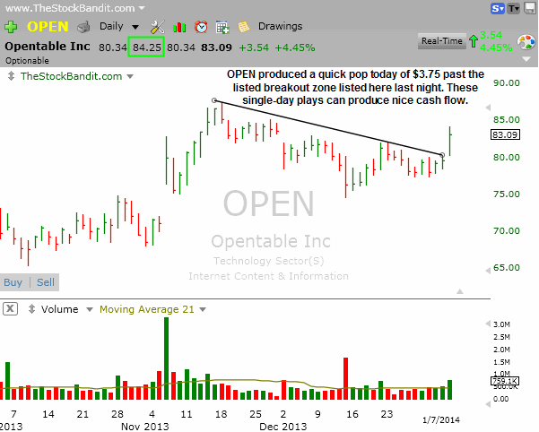 OPEN was listed here last night with a trigger price of $80.50 for a single-day play. Today it showed exactly why I like these kinds of setups as it quickly ran $3.75 beyond that level. It was a clean trend line break and heavy volume produced a nice pop. These single-day plays can produce excellent cash flow while waiting for more swing setups to emerge.