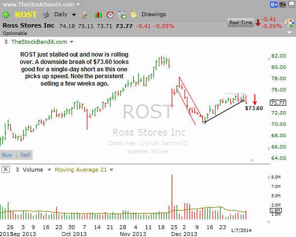 ROST saw lots of steady selling a few weeks ago and the bounce since then has stalled out in recent sessions. Price is starting to undercut rising support here and looks ripe for more selling. I like it for a single-day play on the short side if this one breaks $73.60 on Wednesday, as it could quickly accelerate lower. The risk/reward for a swing just isn’t compelling to me though when comparing a protective buy stop above the bounce high and a first target at the recent low ($2 up vs. $3 down).