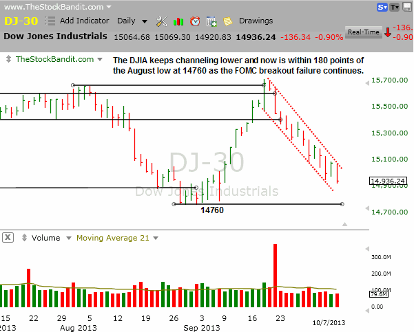 DJIA – The DJIA stayed within its channel today after an inside day on Friday and made new pullback lows since it peaked post-FOMC in mid-September. Next support is the August low at 14760, now less than 180 points away.