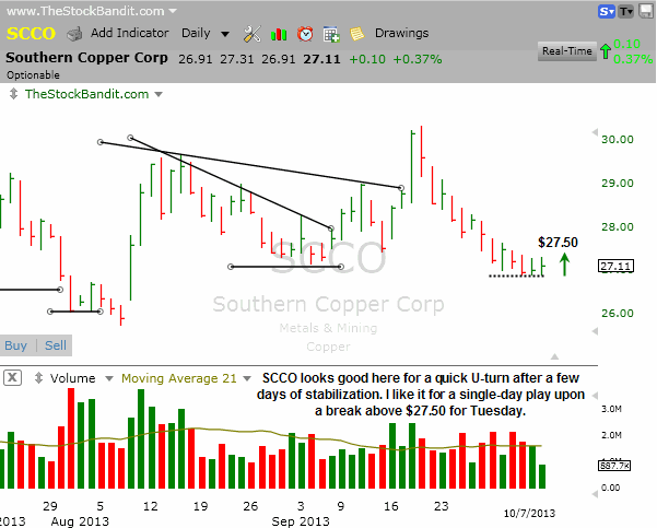 SCCO is not yet acting bullish but it has corrected from its September spike and has stabilized in the past few days. A multi-day high could see a quick lift, which is all I’m interested in. This sets up a single-day play on the long side for Tuesday if price can clear $27.50.