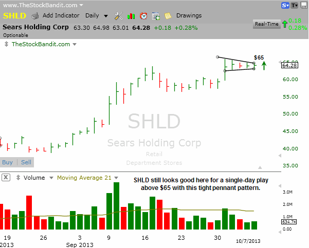 SHLD was listed here last night and maintained its pattern today, so I’m eyeing it again for Tuesday for a single-day play on the long side. This one could pop if it is able to clear the pennant at $65.