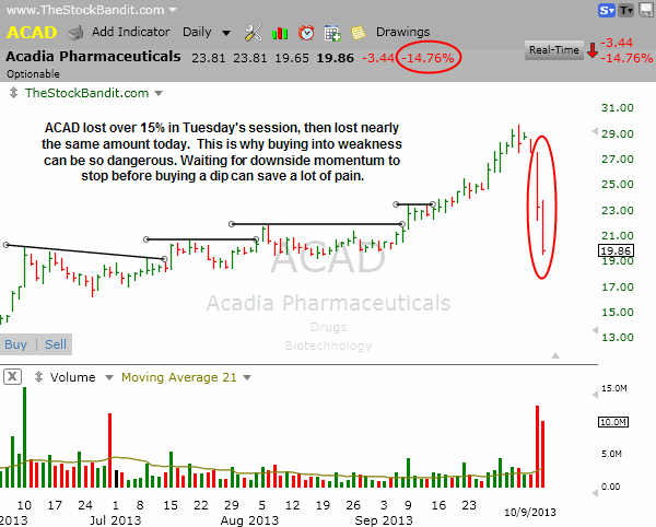 ACAD is a good example of why it’s best to buy after a dip rather than into one. Yesterday this stock shed over 15%, then nearly repeated that decline today as it gave up 14.76% to burn anyone who bought into weakness on Tuesday. Waiting for stability and signs of some continued upside is often better than getting what looks to be a substantial discount, because momentum is extremely tricky to step out in front of.