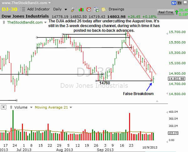 Interestingly, today’s bounce seemed to be purely technical as it did not overlay with any positive talk or developments out of Washington, at least on the debt ceiling or govt. shutdown front. The only real headlines out of D.C. today pertained to Obama’s widely expected nomination of Janet Yellen to succeed Bernanke as the next Fed Chair. We did see the indexes fail to impress, which means that so far this shaky bounce attempt has simply marked a short-term low. The late-day slip was evident of continued nervousness. Just two of the 4 main indexes closed positive on the session (S&P 500 gained a measly 1 point, DJIA gained less than 30), so this market is still a long way from being out of the woods.