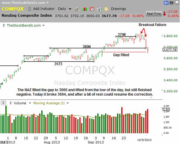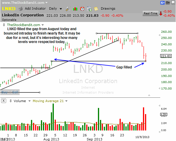 LNKD accelerated lower on Tuesday after repeatedly failing to clear resistance, then continued lower today to fill the gap from August. From there it lifted slightly, but for now it’s respecting that level. This is what “backing and filling” looks like. Many other stocks respected prior levels as well.
