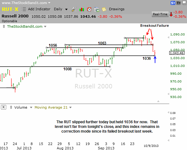 RUT – The RUT has seen 1036 respected from both sides since the second half of July, and today this index got to 1037 before bouncing. Following a quick retreat of 4.6% off the high from just last week, that was a logical spot for the selling to abate. Now we’ll have to see how far a rebound can carry and just how widely embraced the strength is. Should it stall out, expect more cash to get raised from speculative small-cap names.
