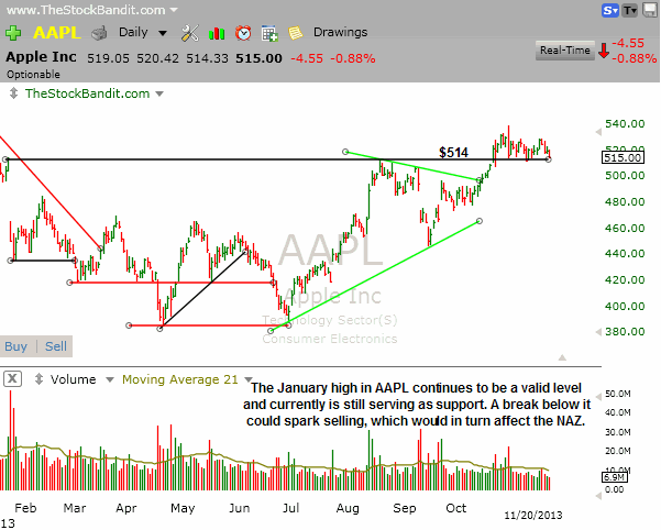 AAPL is continually testing the $514 level from above over the past few weeks since it cleared it. That not only offers a level to watch for this tech leader, but another short-term tell for the NAZ if that level is broken.