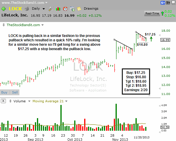 LOCK is in pullback mode here and starting to look similar to the prior dip which was followed by a 10% lift in price. I’m looking for a similar resolution to this pattern so I’ll get long if price clears $17.25 with a stop below the pullback low just in case of a reversal. Earnings are not due out until February so there’s ample time for this one to make a good move.