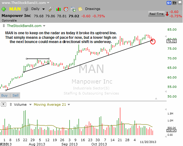 MAN is just now undercutting its uptrend line as of today. This doesn’t mean an end to the uptrend itself (higher highs, higher lows), but rather a change in the pace of the uptrend. Now, a failed bounce from here would certainly open the door for a downside directional shift, so I’ll keep it on watch for now.