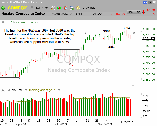 NAZ – The NAZ pushed through 3966 but fell back below it earlier this week, constituting a breakout failure for now. This leaves it range-bound above 3855 near-term support but well shy of the high at 3994.