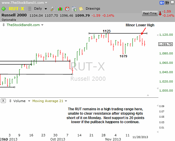 RUT – The RUT failed to clear the prior high after getting within a few points of it on Monday, which now leaves it with a short-term lower high. There’s still 20 points of downside before next support would be found, so lateral is the trend classification for this index until it can find some lasting momentum in either direction.