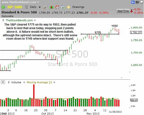 Three of the four averages I watch daily hit new highs on Monday, but each have since pulled back. The RUT failed to break out, while the NAZ was able to break out only to quickly fail and get back beneath resistance. In addition, the RUT had led the way throughout the rally, but in recent weeks has failed to achieve a new high like the others. To see the speculative small-caps lose momentum and the NAZ fail a breakout are perhaps signals we should take note of. That’s not to say the rest of the market just rolls right over and plays dead, but possibly some subtle hints we might not want to overlook.