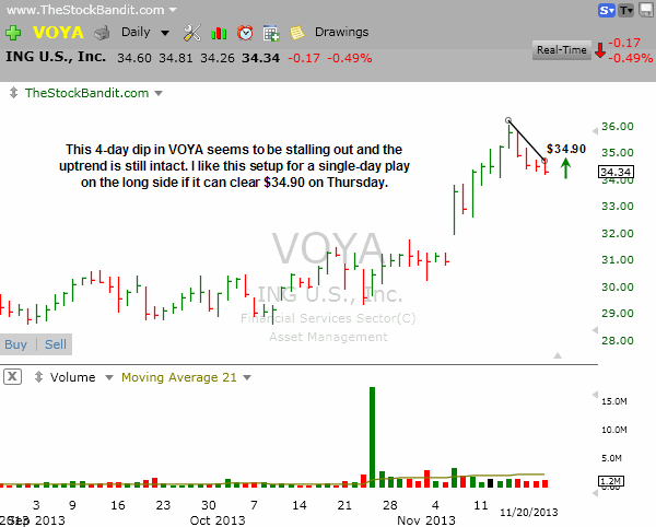 VOYA is one I like for Thursday’s session, but only for a single-day play. Price finished near the low of the session today, so it may need more time, but after a 4-day dip it wouldn’t take much to produce a quick bounce here. I like it on the long side above $34.90 looking for a 2-4% lift as with most single-day plays I consider.