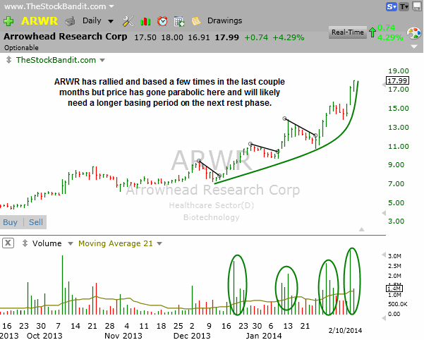 ARWR has gone parabolic after a nice series of rallies and minor pullbacks. Whenever that happens, price usually starts getting more volatile and the next rest phase or base tends to be larger due to more time being needed to digest a parabolic run.
