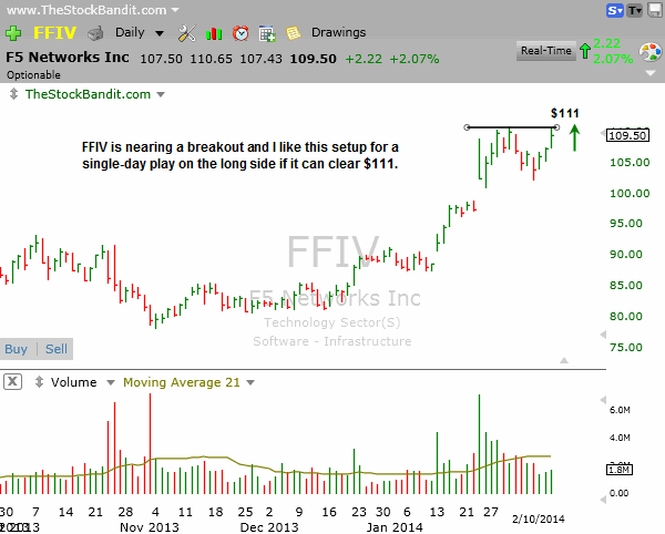 FFIV is at upper resistance here and could break out any day. The base is too broad at this point to consider a swing, but I’d like to grab the initial breakout move so I’m setting up a single-day play for Tuesday if it can clear $111.
