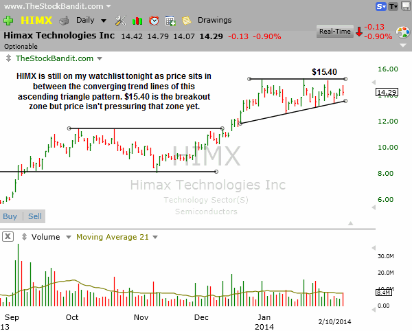 HIMX is still working on its ascending triangle pattern here so I’m keeping it on watch. If price gets up closer to resistance, I’ll look to set up a play.