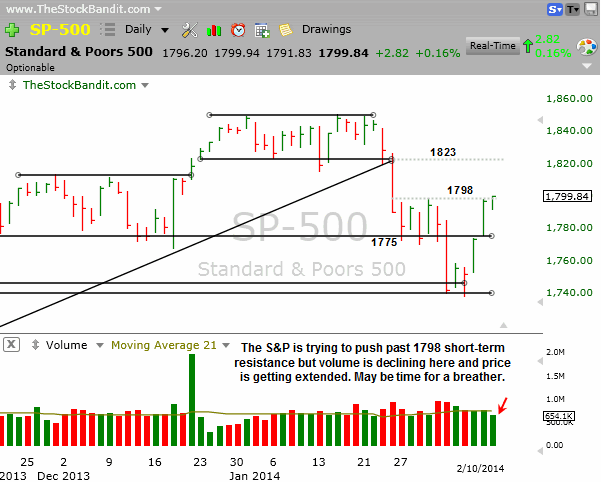 Tomorrow we have scheduled testimony from new Fed head Janet Yellen before Congress. Although there will likely be plenty of get-to-know-you questions, the market will be reading between the lines and that could prompt some price spikes. Given the short-term stretched nature of the market, a cooling off of momentum would seem to be the path of least resistance, although we’ll have to wait to see what tomorrow holds. It’s been a reversal-prone market in the last 3 weeks, so until the pace slows down a bit I’m going to expect more of the same.