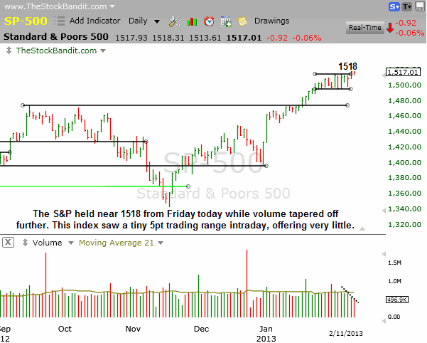 SP500 – The S&P held its ground today and sits just shy of 1518, the 52-week high set last week. Volume is tapering off here though, so that will need to change if we see prices attempt to push higher again. The all-time high is at 1576, which isn’t far, but the bulls have been laying low for a couple of weeks now.