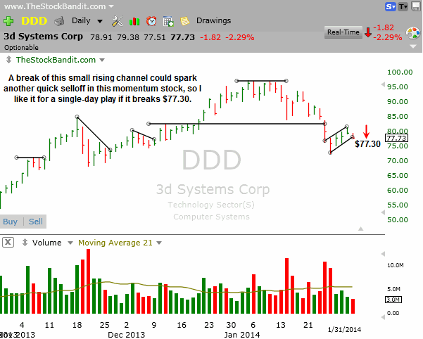 DDD is trying to turn lower here after a bounce last week failed to reclaim former support. A break below $77.30 could see the selling intensify, so I’ll grab it for a single-day play on the short side if that level is broken.