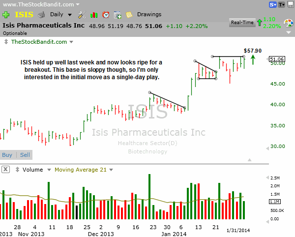 ISIS is facing short-term resistance here and looks good for a quick breakout play. Because this base is still loose, I’m only going for a single-day play here but I like it long above $57.90 for Monday.