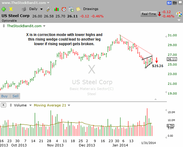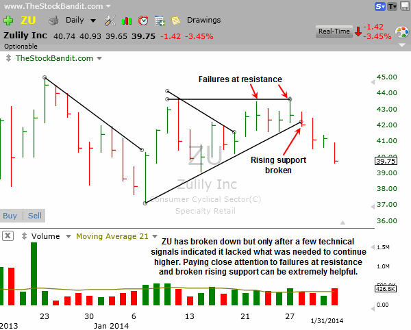 ZU is a good example to highlight as it gave a couple of indications lately that it didn’t have what it needed to continue higher. First it failed at resistance, then broke rising support. Take note of events like this because they can provide early signals to increase caution, lighten up on a position, or exit entirely.