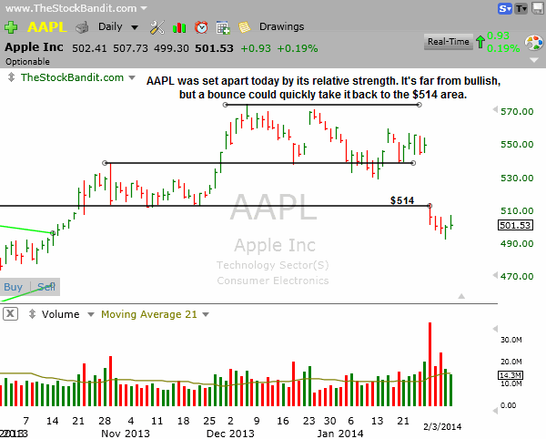 AAPL already reported earnings and actually posted gains on Friday and today to exhibit some relative strength. This isn’t a bullish setup by any means, but it’s acting like it may want to bounce and with the market stretched it could lead the way. Keep it on watch as a potential tell.