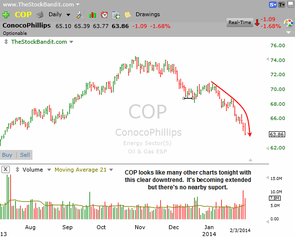 COP is another stock with a big rollover look to it here. There’s zero reason to be bullish here, but chasing it on the short side doesn’t look any better. This is an example of why there are so few setups at the moment.