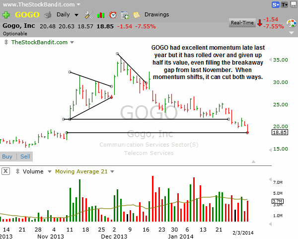 GOGO shows why momentum is so important to respect. Just a couple of months ago, it was running higher with velocity, but since December it has reversed lower and has even filled the breakaway gap from November. Keep stops in place at all times, because you never know when a stock will completely change directions without looking back.