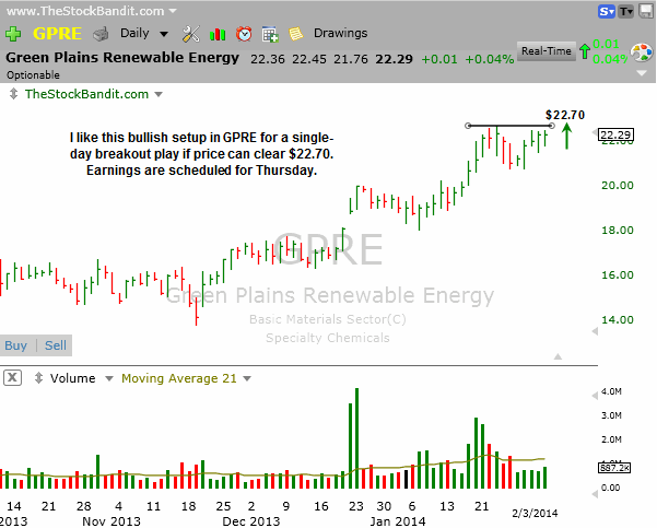 GPRE is holding up well here but earnings are due out on Thursday. I like it for a single-day breakout play for Tuesday if it can clear $22.70 and make a new high.