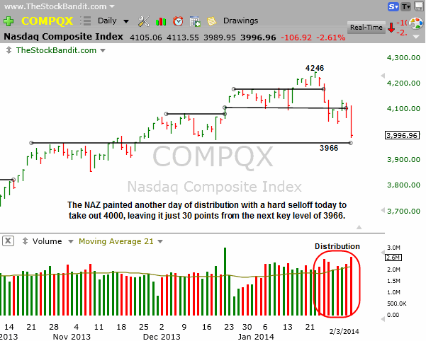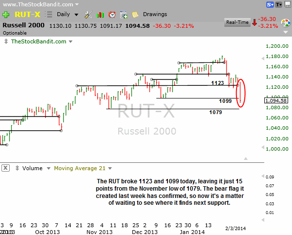 NAZ – The NAZ had a bear flag look to it last night and today it confirmed that pattern with a new correction low. Today’s selloff was relentless and came on heavy volume, making an exclamation point for the bearish argument. Next support is quickly approaching here, now just 30 points away. It has been a fast 250pt slide off the high of less than 2 weeks ago.