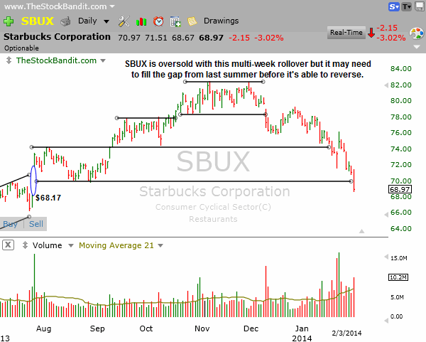 SBUX is getting stretched to the downside but may need to complete the gap fill from last summer before it’s finally ready to stabilize. Like many charts, it’s still bearish but too late for an entry.