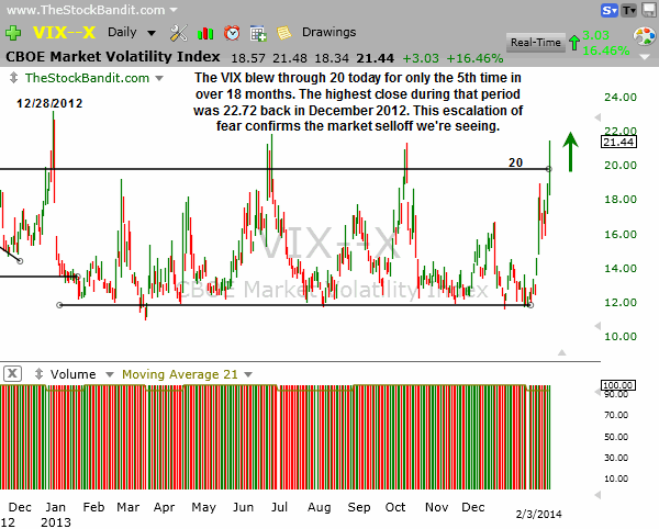 VIX – The VIX punched through 20 and 21 today, confirming the broad market selloff as a signal of escalating fear. Historically this index has needed to get north of 30 or even 40 to mark a lasting market turning point, although in the last 18 months it has only reached the low 20’s before reversing.