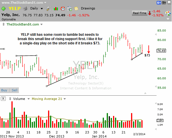 YELP is set to report earnings on Wednesday but may still make a move tomorrow. A break of rising support at $73 looks good for a single-day play, but I will not be holding it overnight.