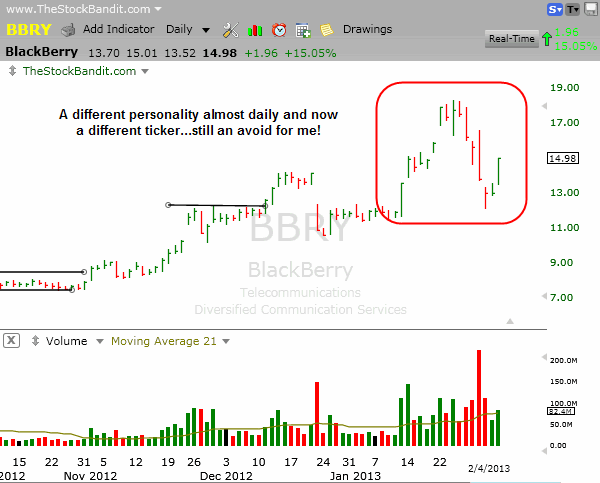 BBRY is the stock formerly known as RIMM, and this thing seems to be having a bit of an identity crisis in more ways than just the ticker symbol. In recent sessions it has rallied sharply ahead of its new operating system and handhelds, sold off on the news, and then screamed higher again today. I continue to believe this is not a stock to hold overnight on either side, leaving it for the intraday traders only until it can calm down.