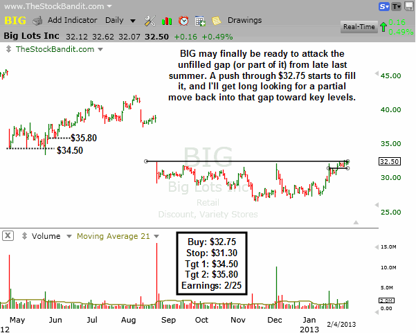 BIG has a large unfilled gap from last summer which it may finally be ready to start attempting to fill. A turn up through $32.75 clears resistance and opens the door for an upside retracement toward a pair of key levels from last spring and early summer. I’ll have a stop set beneath the small lateral trend line which has served as both resistance and support in the past few weeks.
