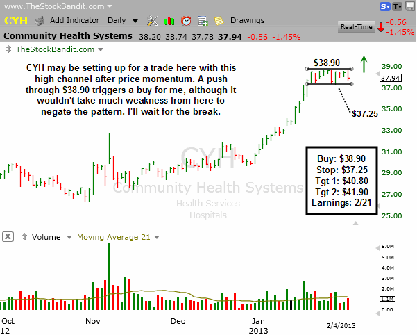 CYH is in a well-defined channel here as it digests its recent rally. Today the stock pulled back within this channel, and should that weakness continue it could negate this pattern, resulting in no play for me. However, price currently is near the midpoint of this channel so I’m setting up the play. I’ll get long if this one can clear $38.90. Earnings are due out Feb. 21, so there’s a bit of time here.