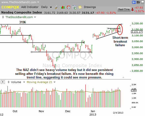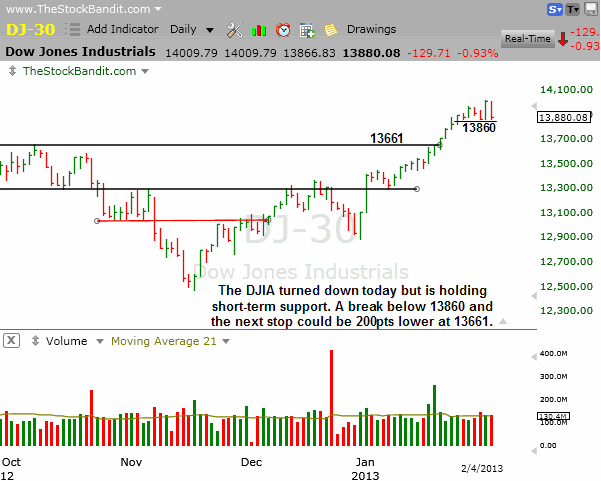 The market put up its worst day of a young 2013 with each of the averages shedding roughly 1% today. Making the day appear even worse, stocks went out at their lows of the day after trending down throughout the session with buyers nowhere in sight. It’s almost as if the bulls decided it wasn’t so bad to book some profits after all!